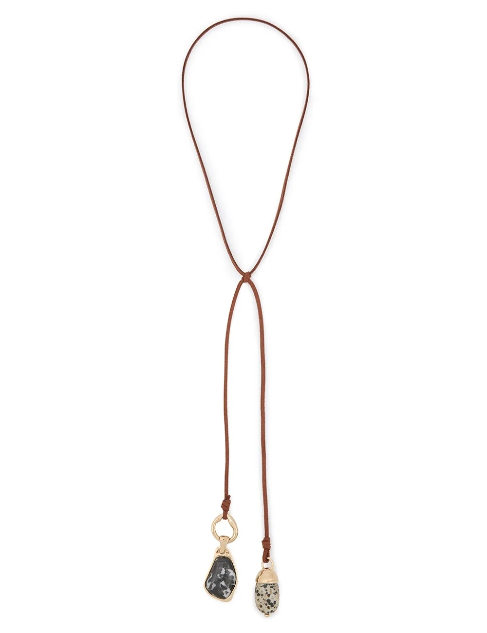 ITEM DETAILS The Ore Lariat Necklace in Gold/Black from our Spring 2025 Collection, Illumination. A wrap cord necklace featuring natural Dalmatian Jasper and Zebra Jasper stones. - Satin rope - 12KT gold plated brass detailing - Natural Dalmatian Jasper and Zebra Jasper stones - Wrap around style with no clasp Style Code: 3801XS25A1 SIZE DETAILS One size. CARE INSTRUCTIONS 65% dalmatian jasper 30% brass 5% polyurethane Our semi-precious stones are hand-cut to enhance their natural beauty, with unique variations in each piece Zimmermann jewellery is made from 12kt gold-plated brass Please remove during exercise, showering, or swimming Keep away from perfumes, acetones, creams, and water to prevent damage or discoloration Clean gently with a soft, lint-free clothavoid cleaning products Store in a cool, dry place, away from direct sunlight and heat Always check the label or care card for specific care instructions.