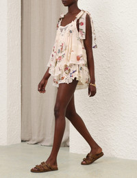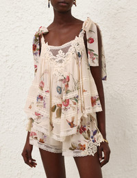 ITEM DETAILS The Patience Cami Top in Vanilla Floral from our Resort Swim 2026 Collection. A cotton-silk blend top featuring a square neckline, bow tie straps, finished with an asymmetric hem and lace trim throughout. - Cotton-silk blend top - High-low style cami - Spliced bodice with lace trim - Fabric tie straps - Elasticated scooped back - Lace detailing - Gathered Style Code: 5582TRS264 SIZE DETAILS 0P 0 1 2 3 4 Length 17.5 19 19 19 19 19 Designed for a relaxed fit This garment fits true to size Available in size 0P, suited to clients who are under 5'3"/ 160cm Model is 5'9.5"/178 cm, bust size 32C/10C and wears a size 0 Item measurements are in inches CARE INSTRUCTIONS Main: 77% cotton, 23% silk; contrast: 100% polyester; lining: 100% viscose; lace: 100% polyester; lace 2: 100% cotton Dry clean only code f (hydrocarbon only); Remove any detachable trims prior to dry cleaning; Cover to protect trim; Iron in low temperature with protective cloth; Light steam only; Do not spot clean Always check the label or care card for specific care instructions.