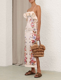 ITEM DETAILS The Patience Frill Midi Dress in Vanilla Floral from our Resort Swim 2026 Collection. A linen midi dress featuring a straight-across neckline with ruffle detailing, criss-cross straps at the back, finished with side skirt splits. - Linen fabric - Sleeveless midi dress - Spaghetti rouleau loop straps tied at the centre back - Bodice frills - Straight style skirt - Placement printed - Lined Style Code: 6147DRS264 SIZE DETAILS 0P 0 1 2 3 4 Length 33.5 37 37 37 37 37 Bust 28.5 30 31.5 34 35.5 38 Waist 26 27 28.5 30.5 32.5 34.5 Hip 31.5 33 35.5 38 39.5 41.5 Slightly fitted across the bust and waist, relaxed through the legs This garment fits true to size Available in size 0P, suited to clients who are under 5'3"/ 160cm Model is 5'9.5"/178 cm, bust size 32C/10C and wears a size 0 Item measurements are in inches CARE INSTRUCTIONS Main: 100% linen; lining: 100% cotton; contrast: 100% linen; fusing: 100% polyester Dry clean only code f (hydrocarbon only); Remove any detachable trims prior to dry cleaning; Cover to protect trim; Iron in low temperature with protective cloth; Light steam only; Do not spot clean Always check the label or care card for specific care instructions.