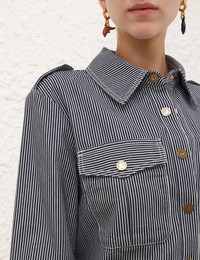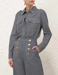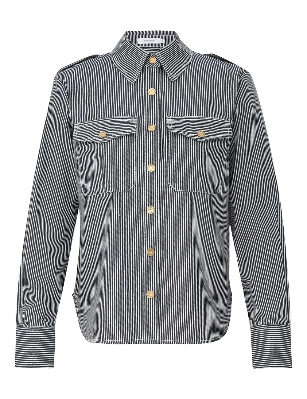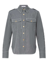 ITEM DETAILS The Patience Striped Denim Shirt in Stripe from our Resort Swim 2026 Collection. A denim shirt featuring a classic collar, front chest pockets, finished with long sleeves and centre front buttons. - Long sleeve denim shirt - Buttoned cuffs - Functional gold buttons down centre front opening - Bar tacks on shoulders - Chest pockets with flaps - Partial side splits Style Code: 5661TRS264 SIZE DETAILS 0P 0 1 2 3 4 Length 23 25 25 25 25.5 25.5 Bust 36 38.5 41 42.5 45 46.5 Sleeve 22 23.5 24 24 24.5 24.5 Regular fit This garment fits true to size Available in size 0P, suited to clients who are under 5'3"/ 160cm Model is 5'9.5"/178 cm, bust size 32C/10C and wears a size 0 Item measurements are in inches CARE INSTRUCTIONS 100% cotton Gentle cold machine wash separately with mild detergent; Remove any detachable trims prior to cleaning Cover to protect trim; Do not soak or bleach; Do not tumble dry; Dry in shade without delay; Iron in low temperature with protective cloth; Do not spot clean; Dry cleanable code p Always check the label or care card for specific care instructions.