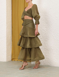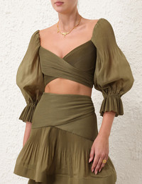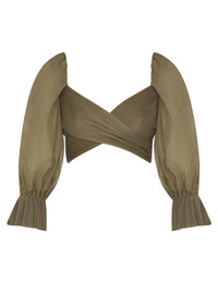 ITEM DETAILS The Pleated Bodice in Olive from our Spring 2024 Collection, Natura. A cropped bodice featuring blouson sleeves with elasticated, fluted cuffs and pleating throughout. - Cropped bodice - V-neck and hem - Blouson sleeves with fluted cuffs - Elastic in shoulders and cuffs - Zip closure at centre back Style Code: 1229TRS24 SIZE DETAILS 0P 0 1 2 3 4 Length 8 10 10 10 10 10 Bust 42 44 48 50 52 54 Sleeve 53 55 56 57 57 58 Fitted through bodice This garment fits true to size Available in size 0P, suited to clients who are under 5'3"/ 160cm Model is 5'9.5"/178 cm, bust size 32C/10C and wears a size 0 Item measurements have been rounded to the nearest cm CARE INSTRUCTIONS Main: 100% polyester Lining: 100% cotton Exclusive of trims Dry clean only code p with protective bag Do not iron Light steam only Do not spot clean Always check the care label for specific care instructions.