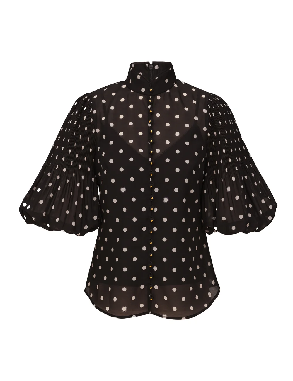 ITEM DETAILS The Pleated Button Blouse in Black Dot from our Spring 2026 Collection, Kindred Spirit. A blouse featuring a high stand collar, centre front rouleau buttons, finished with billow sleeves and elasticated cuffs. - Stand collar with partial V-dip - Quarter-length billow sleeves - Gathered sleeve heads - Elasticated cuffs - Rouleau loops and fabric front buttons - Centre back invisible zip - Comes with a separate cami Style Code: 0524TS26R SIZE DETAILS 0P 0 1 2 3 4 Length 22 23.5 24 24 24.5 25 Bust 34 35.5 38 39.5 41.5 44 Waist 31.5 33 34.5 37 38.5 41 Sleeve 16 17.5 17.5 18 18.5 18.5 Fitted at the neckline, collar and shoulders Relaxed through the body Light-weight, non-stretchy fabric This garment fits true to size Available in size 0P, suited to clients who are under 5'3"/ 160cm Model is 5'9.5"/178 cm, bust size 32C/10C and wears a size 0 Item measurements are in inches CARE INSTRUCTIONS Main: 100% polyester; slip: 86% recycled polyester, 14% elastane Main: Dry clean only code f (hydrocarbon only); Remove any detachable trims prior to dry cleaning; Cover to protect trim; Do not iron; Do not steam; Do not spot clean Slip: Gentle cold hand wash separately with mild detergent; Do not bleach; Dry in shade; Iron in low temperature with protective cloth; Do not tumble dry; Dry cleanable code f (hydrocarbon only); Always check the label or care card for specific care instructions.