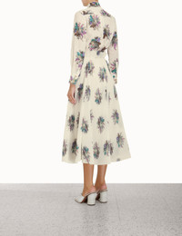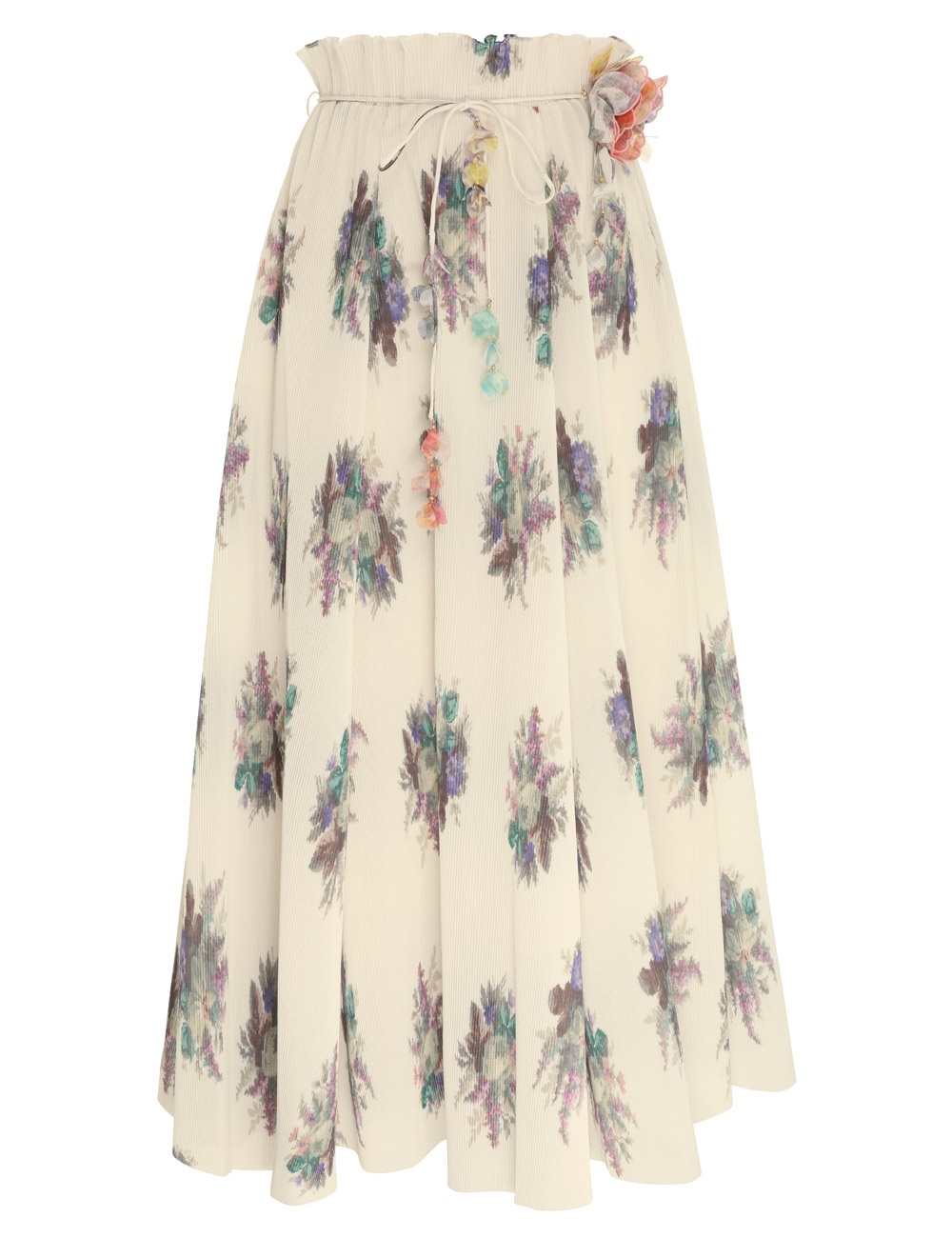 ITEM DETAILS The Pleated Midi Skirt in Ivory Bouquet Floral from our Resort 2023 Collection, High Tide. A pleated midi skirt featuring a frilled elastic waistband, beaded chain belt and a laser cut hem. - Pleated midi skirt - Elastic waistband with frill - Laser cut hem Style Code: 1306SRHIG STYLING Style the skirt with the Classic Crew Neck Tee, layered collection jewellery and the Backless Boat Shoe 85 on your next weekend escape. Wear this style with the Tie Neck Blouse, Enamel Crystal Hoop Earrings and Backless Boat Slide by ZIMMERMANN SIZE DETAILS 0P 0 1 2 3 4 Waist 38 41 46 51 56 60 Hip 109 114 119 124 129 134 Length 79 87 87 87 87 88 This garment fits true to size, we recommend you select your normal size. Available in size 0P, specially designed with petite proportions that are suited to clients who are under 5'3""/ 160cm. Our model is 5'9.5"" / 178 cm, bust size 32C/10C and is wearing a size 0. CARE INSTRUCTIONS Main: 100% polyester Lining: 100% cotton Exclusive of trims Dry clean only code p with protective bag Do not iron Light steam only Do not spot clean Always check the garment care label for specific care instructions.
