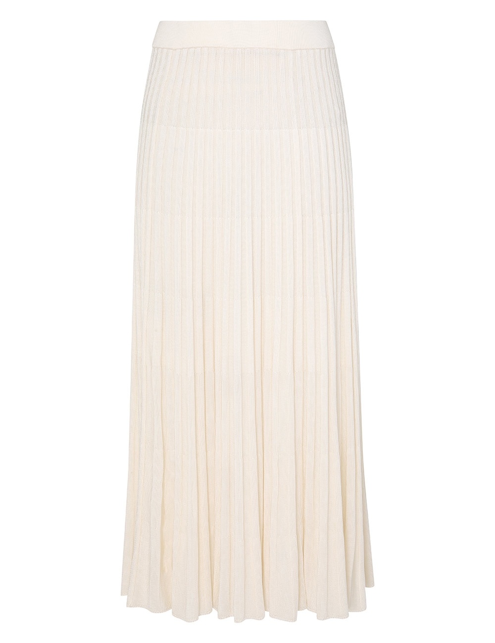 ITEM DETAILS The Pleated Midi Skirt in Parchment from our Spring 2024 Collection, Natura. A ribbed knit midi skirt featuring an elasticated waistband and a soft A-line silhouette. - Ribbed knit - Relaxed midi skirt - Elasticated waistband - Soft A-line silhouette Style Code: 8144SRS24 SIZE DETAILS 0P 0 1 2 3 Length 74 82 82 82 82 Waist 58 60 66 70 76 Elastic waist for an easy fit This garment fits true to size Available in size 0P, suited to clients who are under 5'3"/ 160cm Model is 5'9.5"/178 cm, bust size 32C/10C and wears a size 0 Item measurements have been rounded to the nearest cm CARE INSTRUCTIONS Main: 95% viscose 5% polyamide Contrast: 100% viscose Exclusive of trims Dry clean only code p, inside out with protective bag Cool iron with protective cloth Do not spot clean Store garment flat, do not hang Always check the care label for specific care instructions.