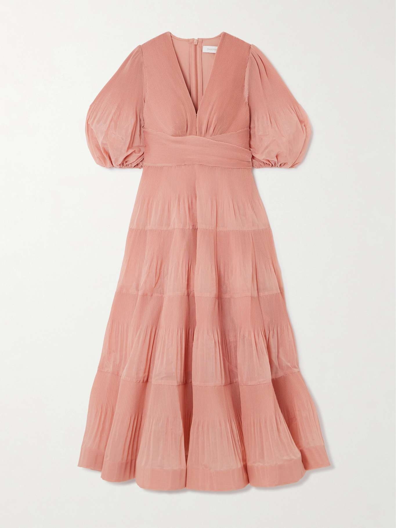 EDITORS'NOTES Zimmermann's midi dress is made from plisse-taffeta in a romantic, tiered design. It has a plunging V-neckline framed by puffed sleeves and a full skirt with a crinoline-style insert at the hem to hold its shape. SIZE & FIT - 00 (petite) = UK 6/ US 2/ FR 34 (under 5’3”/ 160cm) - 0 = UK 8/ US 4/ FR 36 - 1 = UK 10/ US 6/ FR 38 - 2 = UK 12/ US 8/ FR 40 - 3 = UK 14/ US 10/ FR 42 - 4 = UK 16/ US 12/ FR 44 - Fits true to size, take your normal size - Designed to be fitted at the bust and waist, loose at the hip - Lightweight, semi-sheer, non-stretchy fabric - Model is 177cm/ 5'10" and is wearing the designer's size 0 - Bust: 79cm/ 31" - Waist: 61cm/ 24" - Hip: 89cm/ 35" DETAILS & CARE - Blush plisse-taffeta - Concealed zip fastening along back - 100% polyester; lining: 100% cotton - Dry clean