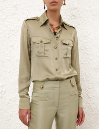 ITEM DETAILS The Pocket Shirt in Khaki from our Cruise 2026 Collection, Twisted Romance. A long sleeve silk shirt featuring a classic collar, front flap pockets, finished with buttons down the centre front. - 100% silk fabric - Fitted cuffs with button closure - Functional buttons down the centre front - Front chest pockets - Bar tacks at shoulders - Asymmetric hem Style Code: 6359TC26R SIZE DETAILS 0P 0 1 2 3 4 Length 25.5 28 28 28.5 28.5 28.5 Bust 39.5 41 43.5 45 47 49 Waist 36 38 40 42.5 44 46.5 Sleeve 19.5 21.5 21.5 21.5 22 22 Designed for a relaxed fit Light-weight, non-stretchy fabric This garment fits true to size Available in size 0P, suited to clients who are under 5'3"/ 160cm Model is 5'9.5"/178 cm, bust size 32C/10C and wears a size 0 Item measurements are in inches CARE INSTRUCTIONS Main: 100% silk Dry clean only code f (hydrocarbon only); Remove any detachable trims prior to dry cleaning; Cover to protect trim; Iron in low temperature with protective cloth; Light steam only; Do not spot clean Always check the label or care card for specific care instructions.