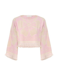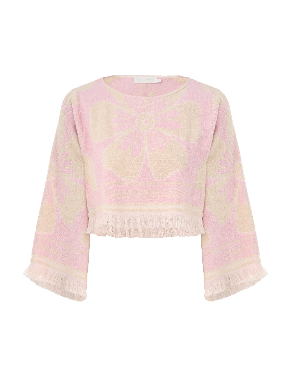 ITEM DETAILS The Pop Long Sleeve Towelling Crop in Pink/Cream from our Summer Swim 2024 Collection. A terry cotton crop featuring fringed edges and ZIMMERMANN branding. - Crop top - Terry cotton - Fringed edges - Long sleeves - Round neckline - ZIMMERMANN branding Style Code: 1417TSS244 SIZE DETAILS 0P 0 1 2 3 Length 16.1 16.5 16.9 17.3 17.3 Bust 39.4 41.7 43.3 45.7 47.2 Sleeve 19.3 20.1 20.5 20.5 20.9 Relaxed fit Mid-weight, non-stretchy fabric This garment fits true to size Available in size 0P, suited to clients who are under 5'3"/ 160cm Model is 5'9.5"/178 cm, bust size 32C/10C and wears a size 0 Item measurements are in inches. CARE INSTRUCTIONS Main: 100% cotton Contrast: 100% cotton Exclusive of trims Gentle cold hand wash separately with mild detergent Do not soak or wring Do not bleach Do not tumble dry Dry flat in shade Cool iron Do not spot clean Do not dry clean Always check the garment care label for specific care instructions.