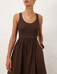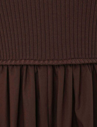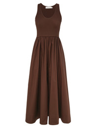 ITEM DETAILS The Poplin Racer Dress in Chocolate from our Spring 2025 Collection, Illumination. A midi dress featuring a fitted knit bodice into gathered cotton poplin skirt, finished with piping around the waist. - Midi dress - Fitted knit bodice - Scoop neckline - Gathered cotton poplin skirt - Racerback - Piping detail at the waist Style Code: 4083DS25R SIZE DETAILS 0P 0 1 2 3 Length 83 92 92 92 92 Bust 52 58 64 68 74 Waist 54 56 62 68 72 Designed to be fitted at the bust and waist, loose at the hip This garment fits true to size Available in size 0P, suited to clients who are under 5'3"/ 160cm Model is 5'9.5"/178 cm, bust size 32C/10C and wears a size 0 Item measurements have been rounded to the nearest cm CARE INSTRUCTIONS Bodice: 55% viscose, 44% polyamide, 1% elastane, skirt: 100% cotton Dry clean only code f (hydrocarbon only); Remove any detachable trims prior to dry cleaning; Cover to protect trim; Cool iron with protective cloth; Light steam only; Do not spot clean Always check the label or care card for specific care instructions.
