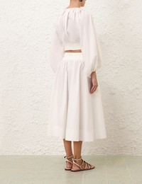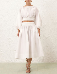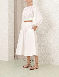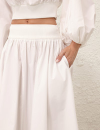 ITEM DETAILS The Poplin Skirt in Ivory from our Spring 2025 Collection, Illumination. A midi skirt featuring a ribbed elasticated waistband, side seam pockets and an invisible centre back zip. - Midi skirt - Ribbed elasticated waistband - Gathered skirt into waist - Side seam pockets - Invisible centre back zip Style Code: 4490SS25R SIZE DETAILS 0P 0 1 2 3 Length 72 80 80 80 80 Waist 46 48 54 58 64 Elastic waist for a flexible fit This garment fits true to size Available in size 0P, suited to clients who are under 5'3"/ 160cm Model is 5'9.5"/178 cm, bust size 32C/10C and wears a size 0 Item measurements have been rounded to the nearest cm CARE INSTRUCTIONS Main: 100% cotton, contrast: 55% viscose, 44% polyamide, 1% elastane Dry clean only code f (hydrocarbon only); Remove any detachable trims prior to dry cleaning; Cover to protect trim; Cool iron with protective cloth; Light steam only; Do not spot clean Always check the label or care card for specific care instructions.