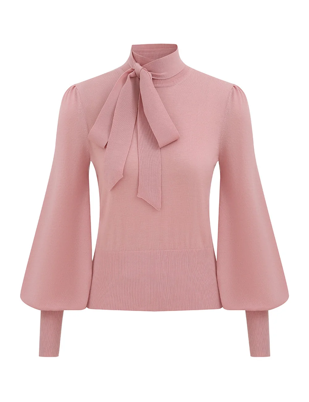 ITEM DETAILS The Pussybow Sweater in Rose from our Fall 2025 Collection, Hypnotic. A wool sweater featuring a stand collar with pussybow necktie and long blouson sleeves with elongated ribbed cuffs. - 100% wool - Ribbed collar, cuffs and hem - Self-tie necktie - Slip on style Style Code: 4885TF25R SIZE DETAILS 0P 0 1 2 3 4 Length 52 55 56 57 57 58 Bust 82 86 92 98 104 108 Waist 74 78 84 90 96 100 Sleeve 63 67 68 69 69 70 Designed for a regular fit This garment fits true to size Available in size 0P, suited to clients who are under 5'3"/ 160cm Model is 5'9.5"/178 cm, bust size 32C/10C and wears a size 0 Item measurements have been rounded to the nearest cm CARE INSTRUCTIONS 100% wool Dry clean only code f (hydrocarbon only); Remove any detachable trims prior to dry cleaning; Cover to protect trim; Cool iron with protective cloth; Do not spot clean; Store garment flat do not hang Always check the label or care card for specific care instructions.
