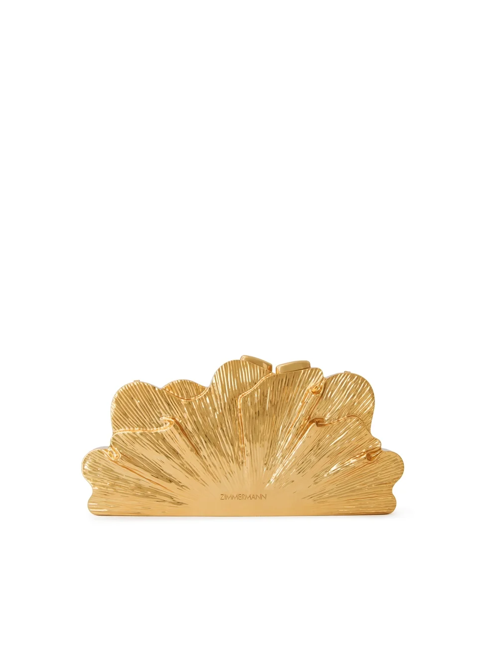 ITEM DETAILS The perfect statement piece to elevate your look, hand-held or worn over the shoulder, the Radiate Clutch is defined by it's radiant metallic gold finish and sculptural flower silhouette. Inspired by the power of ocean waves and delicate beauty of Australian blooms, the Radiate Clutch is a tribute to nature. - Metal - Nappa leather lining - Hand-carry and crossbody - Fixed metal chain - Chain can be concealed inside - Magnetic closure - Shoulder and hand-carry - Internal slip pocket Style Code: 4819XF25A1 SIZE DETAILS Length: 20cm Height: 10.5cm Depth: 3.5cm Handle Drop: 54cm CARE INSTRUCTIONS Main: 90% zinc alloy 10% brass lining: sheep leather Spot clean only if required with a damp clean cloth Always check the label or care card for specific care instructions.