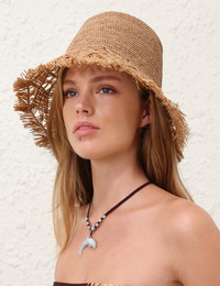 ITEM DETAILS The Raffia Macrame Bucket Hat in Pecan from our Summer Swim 2025 Collection. A raffia fringed bucket hat featuring a tall crown. - Raffia - Bucket hat - Fringed edges Style Code: 3362XS25A2 SIZE DETAILS One size. CARE INSTRUCTIONS 100% raffia Spot clean only if required with a damp clean cloth Always check the label or care card for specific care instructions.