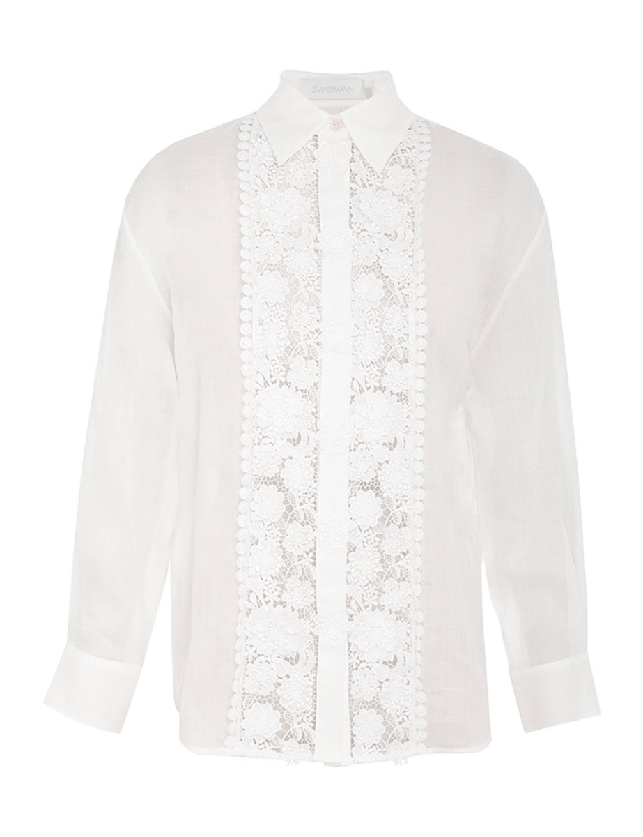 ITEM DETAILS The Raie Lace Flower Shirt in Ivory from our Summer Swim 2023 Collection. A ramie long sleeve shirt featuring a 3D flower insert lace trim. - Ramie long sleeve shirt - Flower insert lace trim throughout - Buttons down centre front - Box pleating at centre back Style Code: 7410TSS232 SIZE DETAILS 0P 0 1 2 3 4 Length 63 68 69 69 70 70 Bust 108 113 118 123 128 133 Sleeve 49 53 53 53 53 53 This garment fits true to size, we recommend you select your normal size. Available in size 0P, specially designed with petite proportions that are suited to clients who are under 5'3"/ 160cm. Our model is 5'9.5" / 178 cm, bust size 32C/10C and is wearing a size 0. Item measurements have been rounded to the nearest cm. CARE INSTRUCTIONS Main: 100% ramie Trim: 100% polyester Exclusive of trims Dry clean only code p with protective bag Cool iron on reverse Turn garment inside out before dry cleaning Do not spot clean Always refer to the garment care label for specific care instructions.