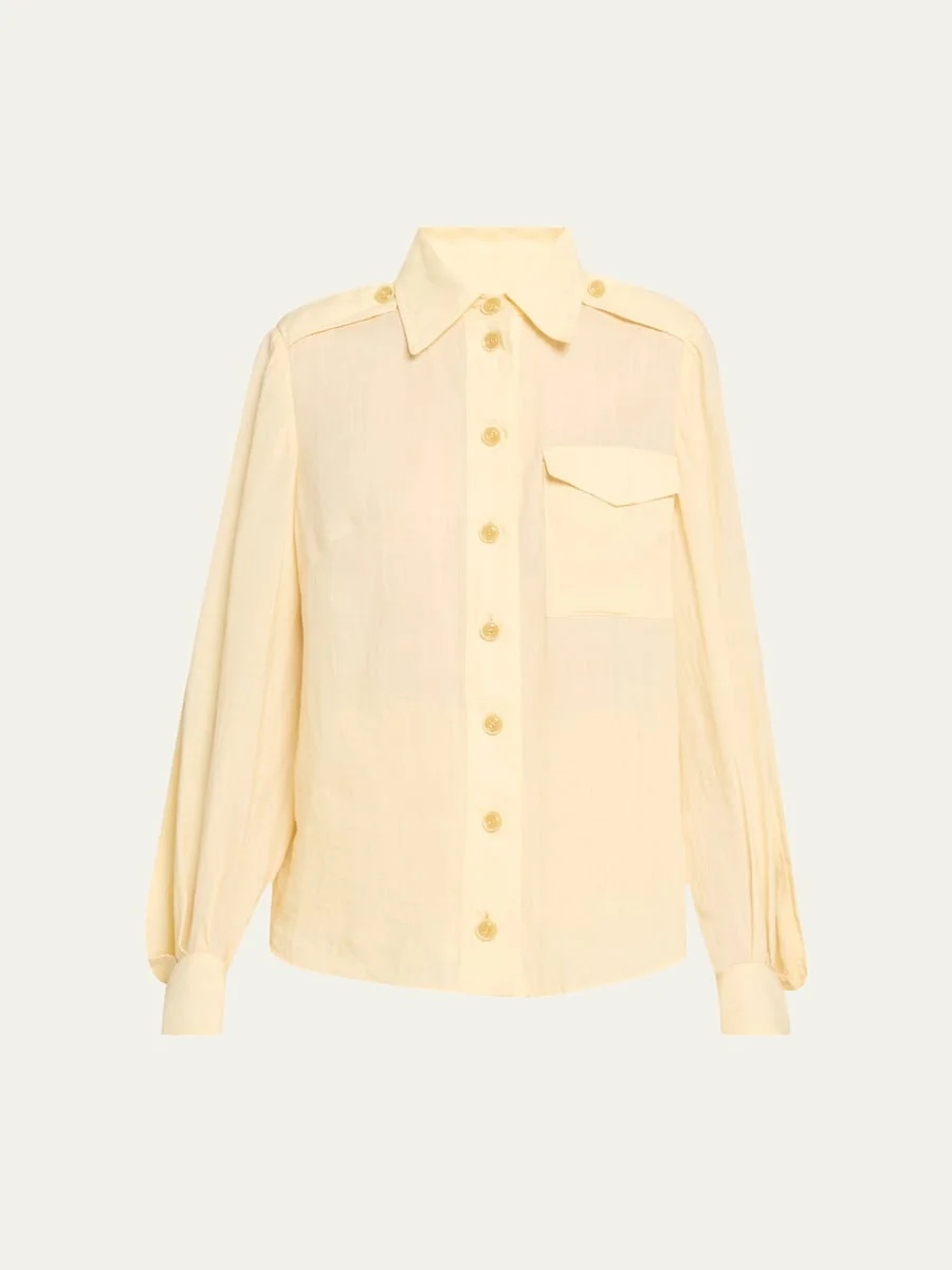 Zimmermann utilityinspired shirt Point collar Epaulets Long voluminous sleeves with button cuffs Chest pocket Classic fit Hem falls to the hip Buttonfront Ramie Imported