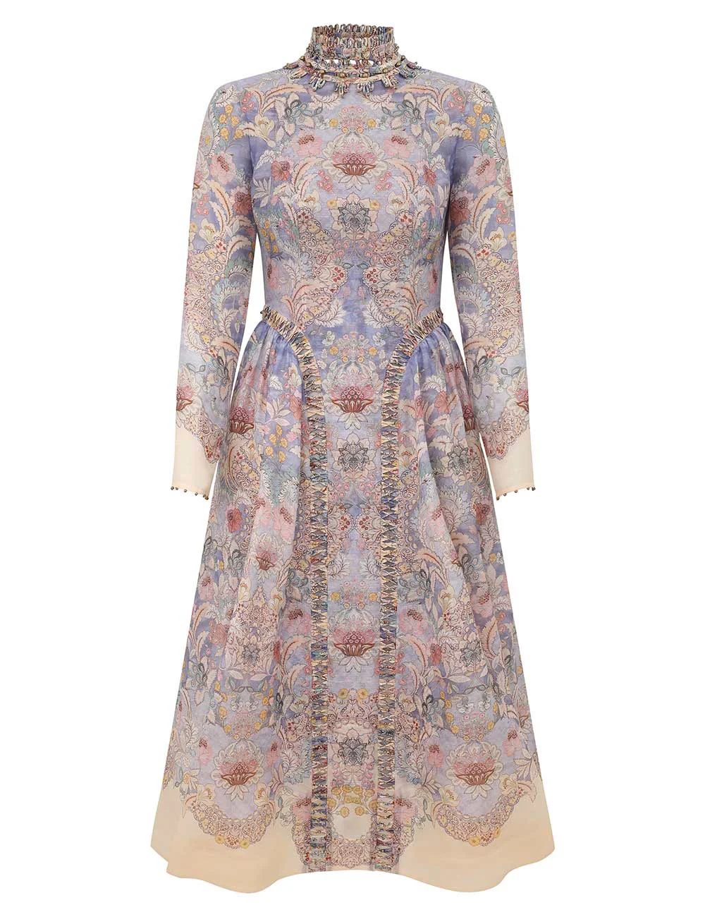 ITEM DETAILS The Rebellion Beaded Midi Dress in Blue Floral from our Cruise 2026 Collection, Twisted Romance. A silk-linen midi dress featuring a stand collar with trim and gold beading, long slim sleeves, a centre back zip closure, and a fully flared skirt. - Silk-linen blend fabric - Button-and-loop closure at centre back collar - Beaded detailing on hip panels and sleeve cuffs - Invisible zip closure at centre back - Fully flared skirt with tulle - Comes with a separate slip Style Code: 6591DC261 SIZE DETAILS 0P 0 1 2 3 4 Length 44.5 48.5 49 49 49 49 Bust 34 36 38 40 42.5 44 Waist 27.5 28.5 30.5 32.5 34.5 36 Sleeve 23 25 25 25 25.5 26 Slightly fitted at the bust and waist, loose at the hip Mid-weight, non-stretchy fabric This garment fits true to size Available in size 0P, suited to clients who are under 5'3"/ 160cm Model is 5'9.5"/178 cm, bust size 32C/10C and wears a size 0 Item measurements are in inches CARE INSTRUCTIONS Main: 55% linen, 45% silk; contrast: 100% polyester; crinoline: 100% polyester; slip: 86% recycled polyester, 14% elastane Dry clean only code f (hydrocarbon only); Remove any detachable trims prior to dry cleaning; Cover to protect trim; Iron in low temperature with protective cloth; Light steam only; Do not spot clean Gentle cold hand wash separately with mild detergent; Do not bleach; Dry in shade; Iron in low temperature with protective cloth; Do not tumble dry; Dry cleanable code f (hydrocarbon only); Always check the label or care card for specific care instructions.