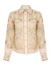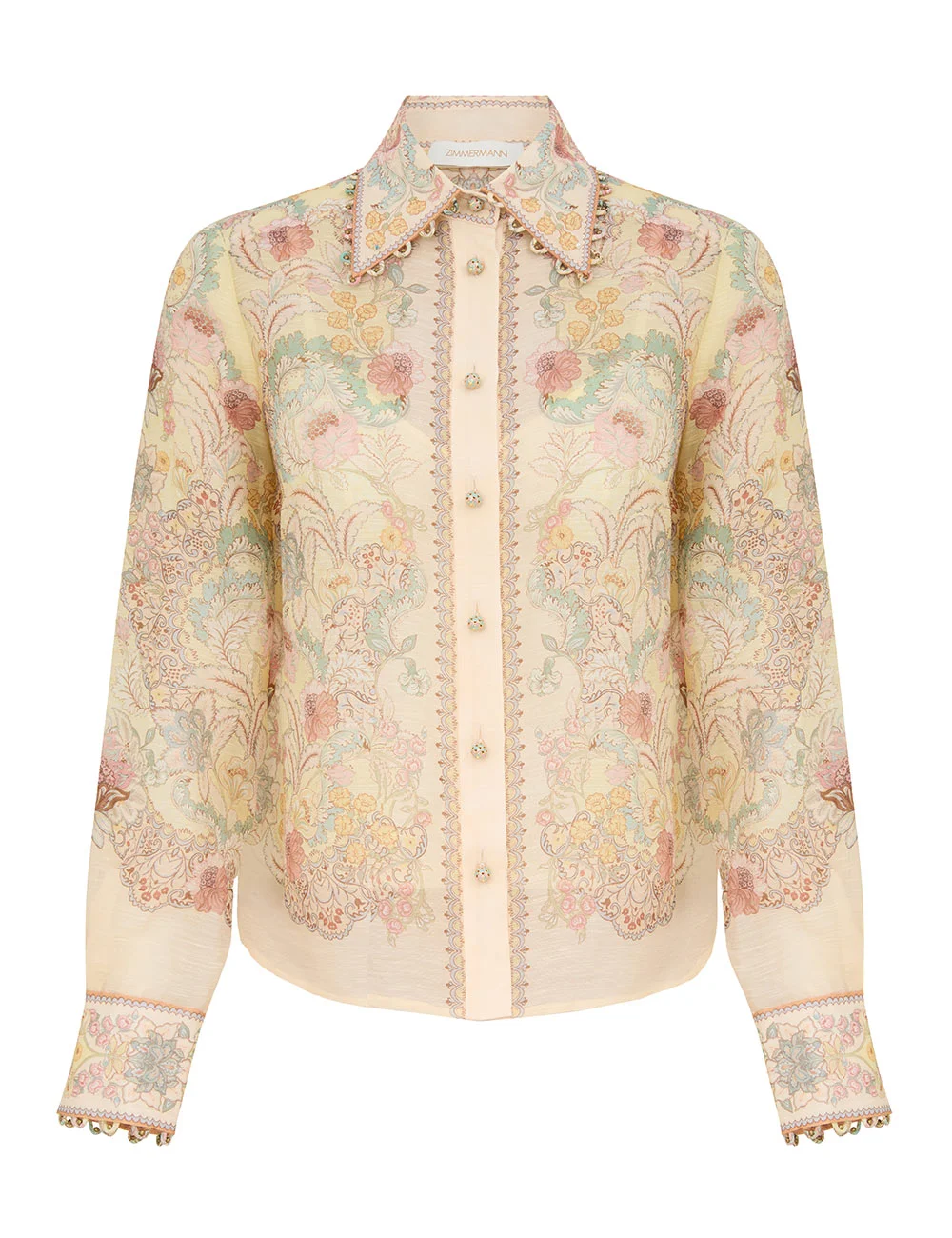 ITEM DETAILS The Rebellion Blouse in Lemon Floral from our Cruise 2026 Collection, Twisted Romance. A silk-linen organza blouse featuring a classic collar, buttons down the centre front, finished with beaded trim detailing. - Silk-linen blend fabric - Long sleeves with buttoned cuffs - Functional buttons at centre front - Beaded trim at collar edge and sleeve cuffs - Comes with a separate cami Style Code: 6931TC261 SIZE DETAILS 0P 0 1 2 3 4 Length 23.5 25 25 25.5 25.5 26 Bust 38 39.5 41.5 43.5 45.5 47 Sleeve 23 25 25 25 25.5 25.5 Designed for a relaxed fit Light-weight, non-stretchy fabric This garment fits true to size Available in size 0P, suited to clients who are under 5'3"/ 160cm Model is 5'9.5"/178 cm, bust size 32C/10C and wears a size 0 Item measurements are in inches CARE INSTRUCTIONS Main: 55% linen, 45% silk; slip: 86% recycled polyester, 14% elastane Dry clean only code f (hydrocarbon only); Remove any detachable trims prior to dry cleaning; Cover to protect trim; Iron in low temperature with protective cloth; Light steam only; Do not spot clean Gentle cold hand wash separately with mild detergent; Do not bleach; Dry in shade; Iron in low temperature with protective cloth; Do not tumble dry; Dry cleanable code f (hydrocarbon only); Always check the label or care card for specific care instructions.
