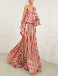 ITEM DETAILS The Rebellion Bohemian Slip Dress in Red Stripe from our Cruise 2026 Collection, Twisted Romance. A tiered maxi dress featuring a square neckline, adjustable rouleau self-tie straps, heavy gathering throughout, and finished with a cascading ruffle overlay. - Spliced sleeveless dress - Cropped frill overlay across neckline - Invisible zip at centre back Style Code: 6508DC261 SIZE DETAILS 0P 0 1 2 3 4 Length 45.5 49.5 49.5 49.5 49.5 49.5 Relaxed fit, with a closer fit at the bust This garment fits true to size Available in size 0P, suited to clients who are under 5'3"/ 160cm Model is 5'9.5"/178 cm, bust size 32C/10C and wears a size 0 Item measurements are in inches CARE INSTRUCTIONS Main: 100% viscose; lining: 100% viscose Dry clean only code f (hydrocarbon only); Remove any detachable trims prior to dry cleaning; Cover to protect trim; Do not steam; Iron in low temperature with protective cloth; Do not spot clean Always check the label or care card for specific care instructions.