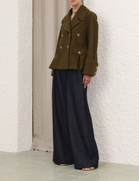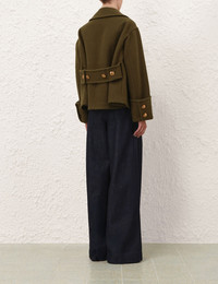 ITEM DETAILS The Rebellion Boucle Peacoat in Army Green from our Cruise 2026 Collection, Twisted Romance. A double breasted wool coat featuring a centre front opening with buttons and a classic collar. - Wool cropped style peacoat - Folded cuffs with gold button detailing - Front flap pockets - Back strap belt feature - Frilled hem Style Code: 6840CC261 SIZE DETAILS XS S M L Length 24 26 26.5 27 Bust 56.5 58.5 62 66 Sleeve 21 22.5 22.5 22.5 Designed for a slightly oversized fit Heavy-weight fabric This garment fits true to size Available in size 0P, suited to clients who are under 5'3"/ 160cm Model is 5'9.5"/178 cm, bust size 32C/10C and wears a size 0 Item measurements are in inches CARE INSTRUCTIONS Main: 100% wool; lining: 75% viscose, 25% silk Dry clean only code f (hydrocarbon only); Remove any detachable trims prior to dry cleaning; Cover to protect trim; Do not steam; Iron in low temperature with protective cloth; Do not spot clean Always check the label or care card for specific care instructions.