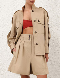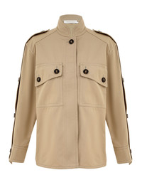 ITEM DETAILS The Rebellion Cargo Jacket in Beige from our Cruise 2026 Collection, Twisted Romance. A cotton cargo jacket featuring a high-low hem, a stand collar and long sleeves, finished with front flap pockets and button detailing throughout. - 100% cotton fabric - Cropped style cargo jacket - Concealed centre front button closure - Heavily gathered - High-low hem Style Code: 6920JC261 SIZE DETAILS 0P 0 1 2 3 4 Length 19 20 20.5 21 21.5 22 Bust 39.5 41 43.5 45 47 49 Waist 38.5 41 42.5 45 46.5 49 Inseam 28 31.5 31.5 31.5 31.5 31.5 Designed for a relaxed fit Mid-weight, non-stretchy fabric This garment fits true to size Available in size 0P, suited to clients who are under 5'3"/ 160cm Model is 5'9.5"/178 cm, bust size 32C/10C and wears a size 0 Item measurements are in inches CARE INSTRUCTIONS Main: 100% cotton Dry clean only code f (hydrocarbon only); Remove any detachable trims prior to dry cleaning; Cover to protect trim; Iron in low temperature with protective cloth; Light steam only; Do not spot clean Always check the label or care card for specific care instructions.