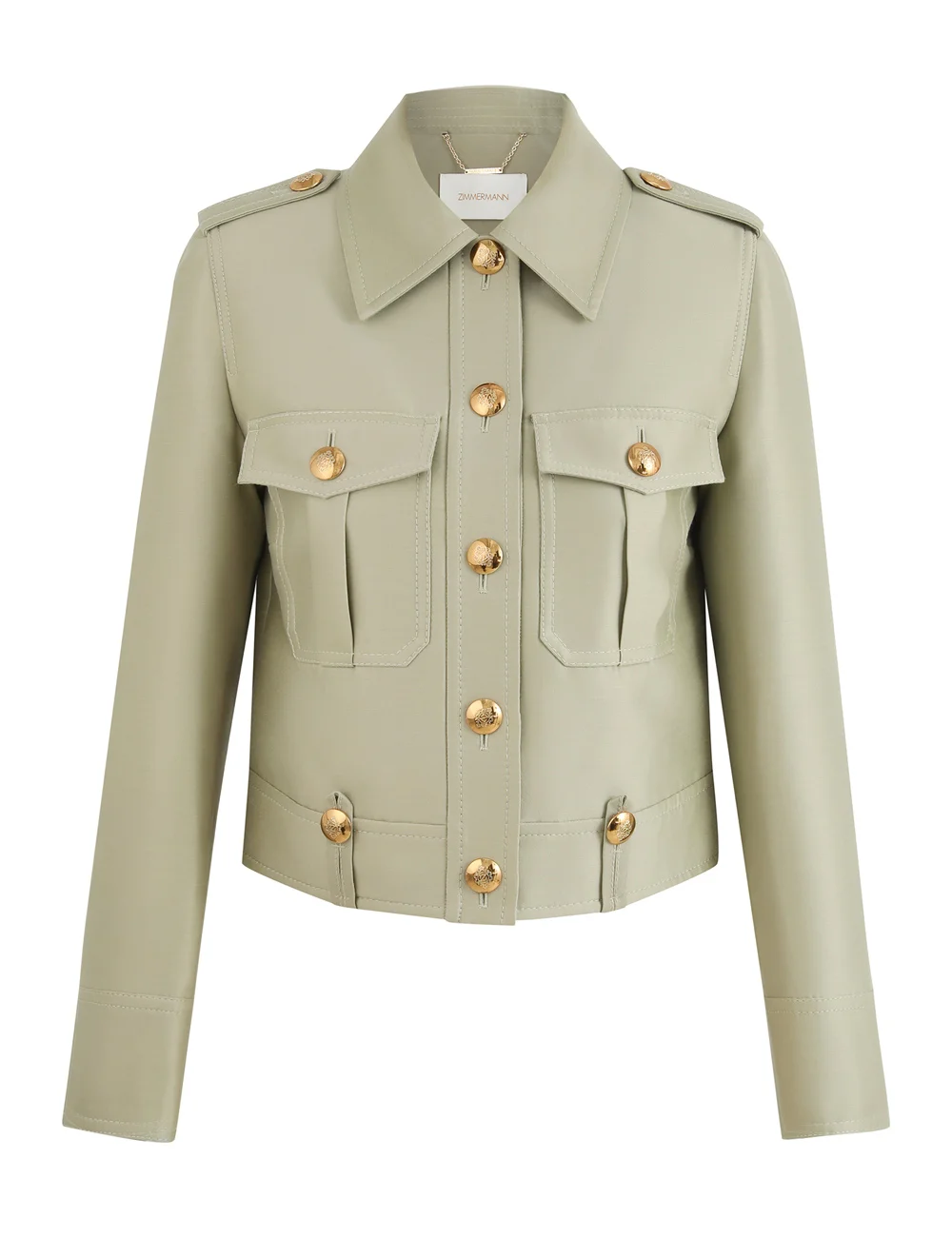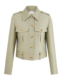 ITEM DETAILS The Rebellion Crop Utility Jacket in Palm from our Cruise 2026 Collection, Twisted Romance. A wool blend cropped jacket featuring a classic collar, gold button detailing and front flap pockets. - Wool blend fabric - Cropped utility jacket - Gold buttons down centre front - Front flap pockets - Bar tacks at shoulders and hem - Fully lined Style Code: 6868JC261 SIZE DETAILS 0P 0 1 2 3 4 Length 15.5 16.5 16.5 17 17.5 17.5 Bust 35.5 37 39.5 41 43.5 45 Sleeve 22 23.5 24 24.5 24.5 25 Tailored, cropped fit Heavy-weight, non-stretchy fabric This garment fits true to size Available in size 0P, suited to clients who are under 5'3"/ 160cm Model is 5'9.5"/178 cm, bust size 32C/10C and wears a size 0 Item measurements are in inches CARE INSTRUCTIONS Main: 92% wool, 8% silk; lining: 75% viscose, 25% silk Dry clean only code f (hydrocarbon only); Remove any detachable trims prior to dry cleaning; Cover to protect trim; Iron in low temperature with protective cloth; Light steam only; Do not spot clean Always check the label or care card for specific care instructions.