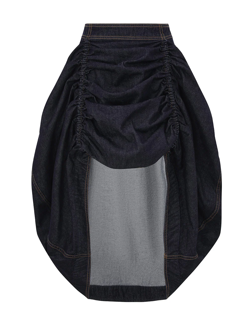 ITEM DETAILS The Rebellion Denim Midi Skirt in Night Sky from our Cruise 2026 Collection, Twisted Romance. A denim midi skirt featuring a dramatic high-low silhouette, heavy ruching across centre front gathered at the sides, finished with top stitching throughout. - Denim high-low skirt - Mid-rise waist - Gold metal zip closure at centre back - Ruching at hip panels Style Code: 6517SC261 SIZE DETAILS 0P 0 1 2 3 4 Length 29 32 32 32 32 32 Waist 29 30.5 32.5 34.5 37 38.5 Fitted at the waist, relaxed through the hips and legs Heavy-weight, non-stretchy fabric This garment fits true to size Available in size 0P, suited to clients who are under 5'3"/ 160cm Model is 5'9.5"/178 cm, bust size 32C/10C and wears a size 0 Item measurements are in inches CARE INSTRUCTIONS Main: 75% cotton 25% viscose; pocketing: 86% polyester 14% cotton Gentle cold machine wash separately with mild detergent; Remove any detachable trims prior to cleaning Cover to protect trim; Do not soak or bleach; Do not tumble dry; Dry in shade without delay; Iron in low temperature with protective cloth; Do not spot clean; Dry cleanable code p Always check the label or care card for specific care instructions.