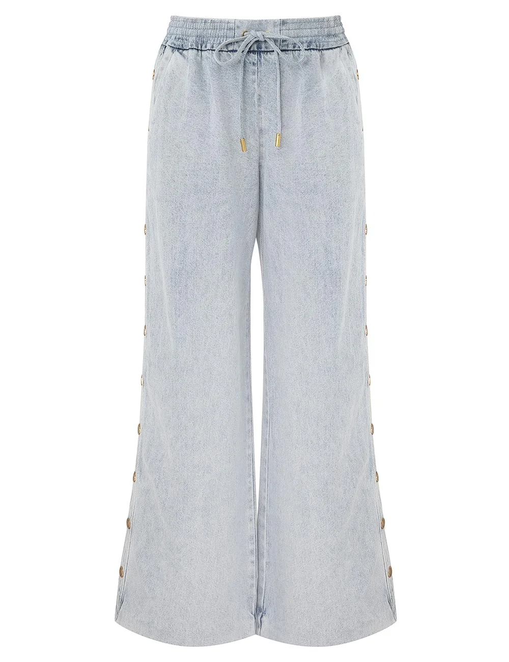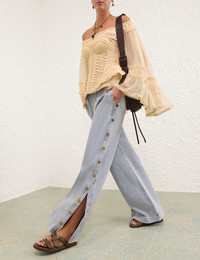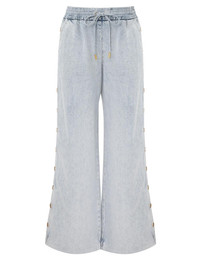 ITEM DETAILS The Rebellion Denim Snap Pant in Castaway from our Cruise 2026 Collection, Twisted Romance. A denim pant featuring an elasticated waistband, rouleau tie with eyelets, wide hem, finished with snap button detailing along both side panels. - Denim wide leg pant - Mid-rise, drawstring waist - Functional pockets - Gold snap buttons along both side seams Style Code: 7002PC261 SIZE DETAILS 0P 0 1 2 3 4 Length 36 40.5 41 41 41.5 41.5 Waist 26 27 29 31.5 33 35.5 Hip 38 39.5 41.5 43.5 45.5 47 Inseam 27 30.5 30.5 30.5 30.5 30.5 Elastic waist for a flexible fit Mid-rise waist with a full-length leg Mid-weight, non-stretchy fabric This garment fits true to size Available in size 0P, suited to clients who are under 5'3"/ 160cm Model is 5'9.5"/178 cm, bust size 32C/10C and wears a size 0 Item measurements are in inches CARE INSTRUCTIONS Main: 100% cotton; pocketing: 86% polyester, 14% cotton Gentle cold machine wash separately with mild detergent; Remove any detachable trims prior to cleaning Cover to protect trim; Do not soak or bleach; Do not tumble dry; Dry in shade without delay; Iron in low temperature with protective cloth; Do not spot clean; Dry cleanable code p Always check the label or care card for specific care instructions.