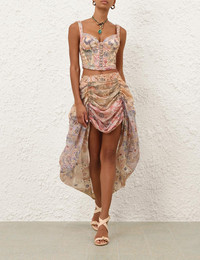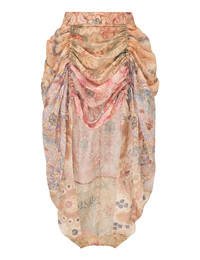 ITEM DETAILS The Rebellion Draped Midi Skirt in Spliced Floral from our Cruise 2026 Collection, Twisted Romance. A silk-linen skirt featuring a fixed waistband, dramatic high-low hem, and heavy ruched detailing, finished with a spliced pattern and invisible zip closure at the back. - Silk-linen blend fabric - Mid-rise waist with high-low hem - Invisible zip closure at centre back - Ruched gathering at centre front and back Style Code: 7140SC261 SIZE DETAILS 0P 0 1 2 3 4 Front Length9.5 9.5 9.5 10 10 10.5 Back Length Length Waist 26 27.5 29 31.5 33 35.5 Designed to be fitted at the waist, relaxed through the hips This garment fits true to size Available in size 0P, suited to clients who are under 5'3"/ 160cm Model is 5'9.5"/178 cm, bust size 32C/10C and wears a size 0 Item measurements are in inches CARE INSTRUCTIONS Main: 55% linen, 45% silk; lining: 100% cotton; crinoline: 100% polyester Dry clean only code f (hydrocarbon only); Remove any detachable trims prior to dry cleaning; Cover to protect trim; Iron in low temperature with protective cloth; Light steam only; Do not spot clean Always check the label or care card for specific care instructions.