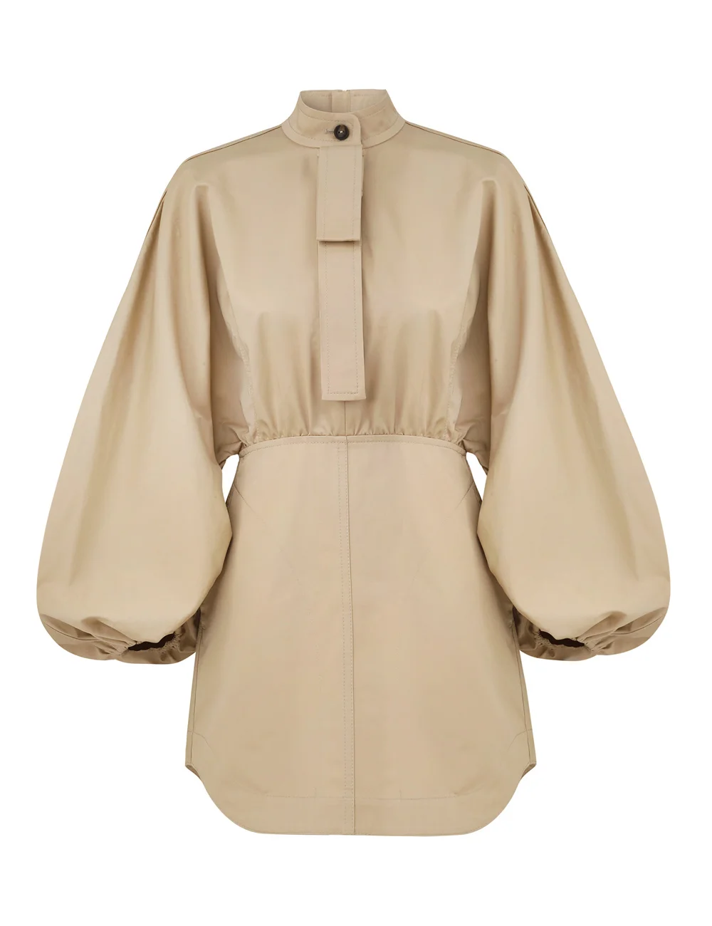 ITEM DETAILS The Rebellion Drawn Mini Dress in Beige from our Cruise 2026 Collection, Twisted Romance. A cotton mini dress featuring a stand collar, detachable necktie, centre front buttons and long blouson sleeves with elasticated cuffs. - 100% cotton fabric - High neckline with button closure - Long necktie - Drawstring sleeves with rouleau ties at cuffs - Invisible zip closure at centre back - Side pockets - Asymmetric hem Style Code: 6918DC261 SIZE DETAILS 0P 0 1 2 3 4 Length 31.5 34 34 34.5 35 36 Bust 27.5 28.5 29 30.5 31.5 32.5 Waist 26 27 29 30.5 33 34.5 Hip 36 38.5 40 42.5 44 46.5 Sleeve 20.5 21.5 21.5 21.5 21.5 21.5 Designed for a relaxed fit Mid-weight, non-stretchy fabric This garment fits true to size Available in size 0P, suited to clients who are under 5'3"/ 160cm Model is 5'9.5"/178 cm, bust size 32C/10C and wears a size 0 Item measurements are in inches CARE INSTRUCTIONS Main: 100% cotton; yoke lining: 100% cotton Dry clean only code f (hydrocarbon only); Remove any detachable trims prior to dry cleaning; Cover to protect trim; Iron in low temperature with protective cloth; Light steam only; Do not spot clean Always check the label or care card for specific care instructions.