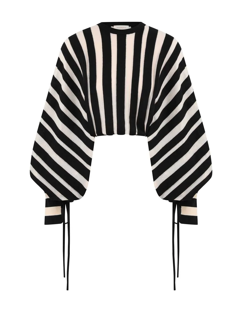 ITEM DETAILS The Rebellion Drawn Sweater in Black/Cream Stripe from our Cruise 2026 Collection, Twisted Romance. A cotton blend sweater featuring a crew neckline, long billow sleeves with elongated fitted cuffs and a contrasting stripe design. - Cropped knit sweater - Voluminous sleeves - Ribbed cuffs with rouleau ties - Ribbed crew neckline Style Code: 7321TC261 SIZE DETAILS 0P 0 1 2 3 4 Length 17.5 19 19.5 19.5 19.5 19.5 Sleeve 19.5 20.5 20.5 20.5 20.5 20.5 Designed with an elasticated waist for a flexible fit This garment fits true to size Available in size 0P, suited to clients who are under 5'3"/ 160cm Model is 5'9.5"/178 cm, bust size 32C/10C and wears a size 0 Item measurements are in inches CARE INSTRUCTIONS 44% cotton 36% linen 20% recycled polyester Dry clean only code f (hydrocarbon only) Remove any detachable trims prior to dry cleaning Cover to protect trim Iron in low temperature with protective cloth Do not spot clean Store garment flat do not hang Always check the label or care card for specific care instructions.