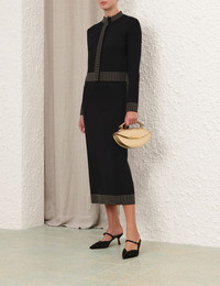 ITEM DETAILS The Rebellion Embellished Cardigan in Black from our Cruise 2026 Collection, Twisted Romance. A merino wool cardigan featuring a stand collar, concealed centre front closure and gold-studded embellishments throughout. - Wool-cashmere blend - Slim fit cardigan - Stand collar with single button closure - Gold buttons down the concealed front opening - Ribbed neckline, cuff and hem - Gold studded embellishments throughout Style Code: 7227TC261 SIZE DETAILS 0P 0 1 2 3 4 Length 17.5 18.5 19 19.5 19.5 19.5 Bust 32.5 34.5 36 38.5 40 42.5 Sleeve 22.5 24 24.5 25 25 25 Designed for a close fit This garment fits true to size Available in size 0P, suited to clients who are under 5'3"/ 160cm Model is 5'9.5"/178 cm, bust size 32C/10C and wears a size 0 Item measurements are in inches CARE INSTRUCTIONS 90% merino wool, 10% cashmere Dry clean only code f (hydrocarbon only) Remove any detachable trims prior to dry cleaning Cover to protect trim Iron in low temperature with protective cloth Do not spot clean Store garment flat do not hang Always check the label or care card for specific care instructions.