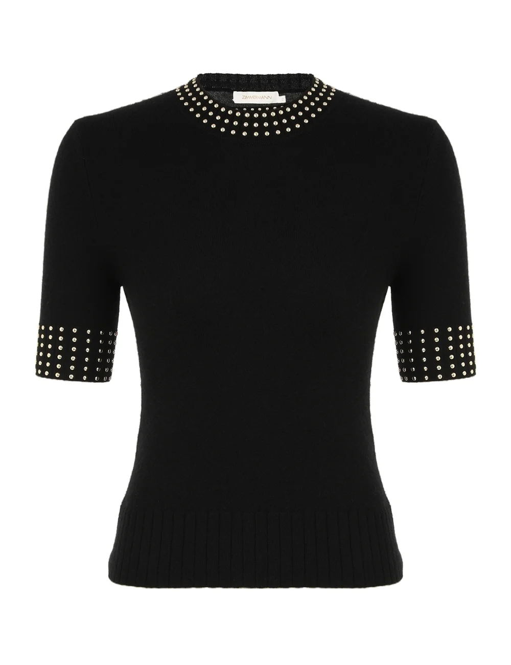 ITEM DETAILS The Rebellion Embellished Tee in Black from our Cruise 2026 Collection, Twisted Romance. A merino wool tee featuring a crew neckline, fitted sleeves and gold-studded embellishments to the collar and sleeve cuffs. - Wool-cashmere blend - Crew neckline - Short, fitted sleeves - Gold stud embellishments on collar and sleeves - Slim fit Style Code: 7075TC261 SIZE DETAILS 0P 0 1 2 3 4 Length 19.5 20.5 21 21.5 21.5 21.5 Bust 29 30.5 33 35.5 37 39.5 Waist 26 27.5 30 32.5 34 36 Sleeve 10 10 10 10.5 11 11 Designed for a close fit This garment fits true to size Available in size 0P, suited to clients who are under 5'3"/ 160cm Model is 5'9.5"/178 cm, bust size 32C/10C and wears a size 0 Item measurements are in inches CARE INSTRUCTIONS 90% merino wool, 10% cashmere Dry clean only code f (hydrocarbon only) Remove any detachable trims prior to dry cleaning Cover to protect trim Iron in low temperature with protective cloth Do not spot clean Store garment flat do not hang Always check the label or care card for specific care instructions.