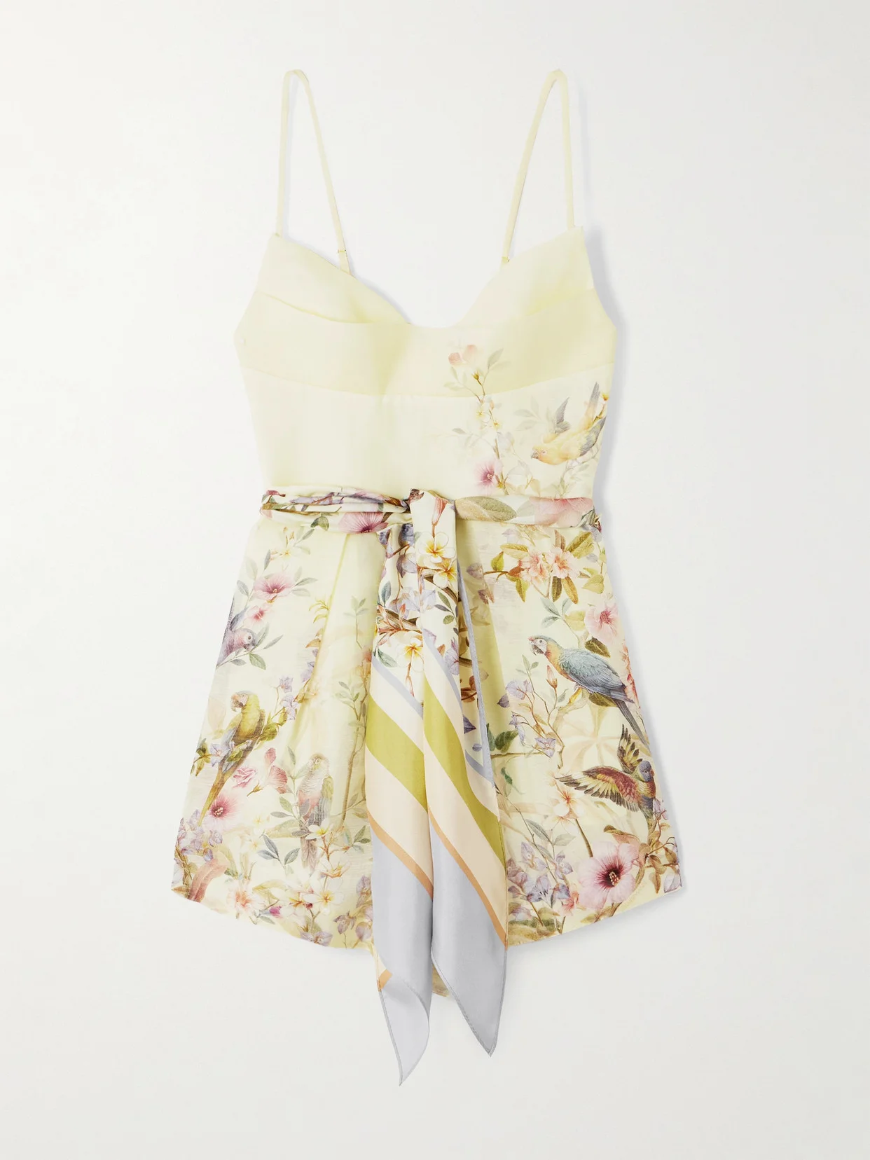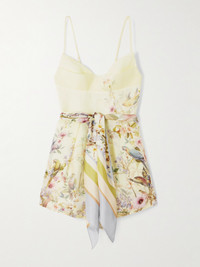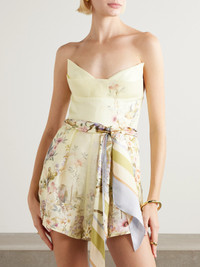 Zimmermann's 'Rebellion' playsuit is patterned with a painterly scene of tropical birds and lush blooms. Cut from a linen and silk-blend, it features a boned bodice with slim, adjustable straps that can also be removed for a strapless silhouette.