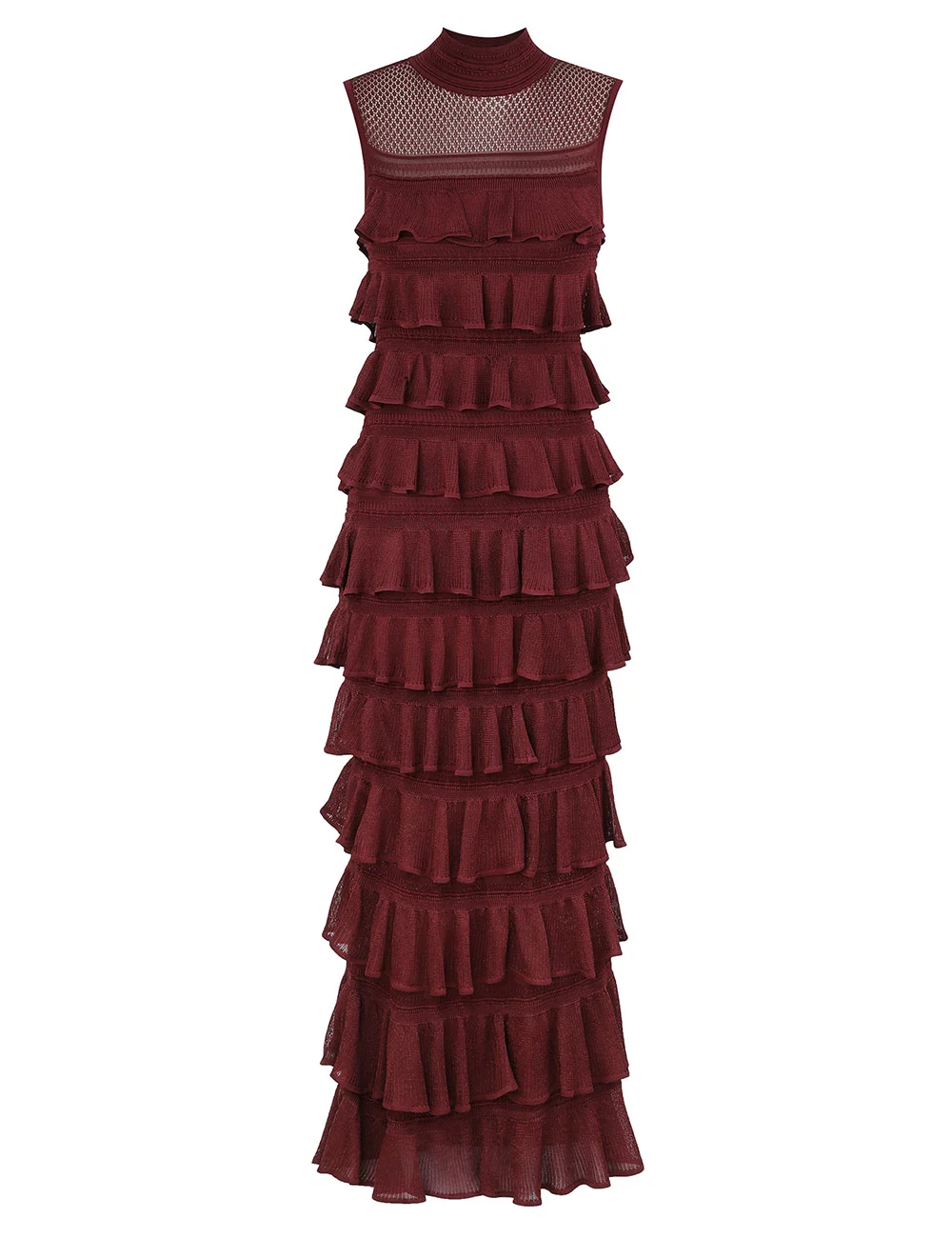 ITEM DETAILS The Rebellion Frill Midi Dress in Burgundy from our Cruise 2026 Collection, Twisted Romance. A knit midi-length dress featuring a stand collar, square mesh panelling and cascading frills throughout. - Sleeveless knit dress - Ribbed stand collar - Mesh panelling across neckline - Tiered frills throughout Style Code: 6736DC261 SIZE DETAILS 0P 0 1 2 3 4 Length 43.5 47.5 48 48.5 48.5 49 Bust 27.5 30 32.5 34 36 38 Hip 30 31.5 34 36 38 40 Designed for a close fit When trying on this style, pull it on overhead This garment fits true to size Available in size 0P, suited to clients who are under 5'3"/ 160cm Model is 5'9.5"/178 cm, bust size 32C/10C and wears a size 0 Item measurements are in inches CARE INSTRUCTIONS Main: 100% viscose Frill: 74% viscosre 22% polyamide 4% polyester Lining: 100% viscose Dry clean only code f (hydrocarbon only) Remove any detachable trims prior to dry cleaning Cover to protect trim Iron in low temperature with protective cloth Do not spot clean Store garment flat do not hang Always check the label or care card for specific care instructions.