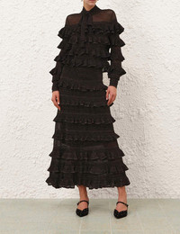 ITEM DETAILS The Rebellion Frill Midi Skirt in Metallic Black from our Cruise 2026 Collection, Twisted Romance. A knit midi skirt featuring an elasticated waistband and tiered ruffle details throughout. - High-waisted, midi skirt - Cascading frills throughout - Ribbed panelling - Contrasting trim - Slim fit - Slip on style Style Code: 7314SC261 SIZE DETAILS 0P 0 1 2 3 4 Length 28 31 31 31 31 31 Waist 23 23.5 26 28.5 30 32.5 Hip 30.5 32.5 34.5 37 38.5 41 Designed with an elasticated waist for a flexible fit This garment fits true to size Available in size 0P, suited to clients who are under 5'3"/ 160cm Model is 5'9.5"/178 cm, bust size 32C/10C and wears a size 0 Item measurements are in inches CARE INSTRUCTIONS Main: 56% viscose 32% polyester 13% metallised fibre Lining: 100% viscose Dry clean only code f (hydrocarbon only) Remove any detachable trims prior to dry cleaning Cover to protect trim Iron in low temperature with protective cloth Do not spot clean Store garment flat do not hang Always check the label or care card for specific care instructions.