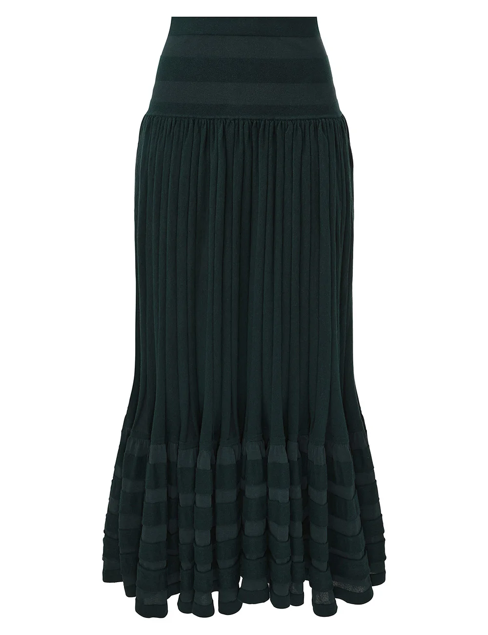ITEM DETAILS The Rebellion Gathered Midi Skirt in Teal from our Cruise 2026 Collection, Twisted Romance. A midi-length knit skirt featuring an elasticated waistband, pleats throughout and a frilled hem. - Mid-rise knit skirt - Elongated waistband - Frill hem - Heavy gathering below the waist panel - Slip on style Style Code: 6612SC261 SIZE DETAILS 0P 0 1 2 3 4 Length 32 35.5 35.5 35.5 35.5 35.5 Waist 23.5 24.5 27 29 30.5 33 Hip 26 27.5 34 32.5 34 36 Elastic waist for a flexible fit This garment fits true to size Available in size 0P, suited to clients who are under 5'3"/ 160cm Model is 5'9.5"/178 cm, bust size 32C/10C and wears a size 0 Item measurements are in inches CARE INSTRUCTIONS 44% cotton 36% linen 20% recycled polyester Dry clean only code f (hydrocarbon only) Remove any detachable trims prior to dry cleaning Cover to protect trim Iron in low temperature with protective cloth Do not spot clean Store garment flat do not hang Always check the label or care card for specific care instructions.