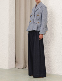 ITEM DETAILS The Rebellion Herringbone Peacoat in Cream/Denim from our Cruise 2026 Collection, Twisted Romance. A double breasted coat featuring a centre front opening with buttons and a classic collar. - Cropped style peacoat - Gold button detailing throughout - Front flap pockets - Back strap belt feature - Folded cuffs with gold button detailing - Frilled hem Style Code: 7450CC261 SIZE DETAILS XS S M L Length 24 26 26.5 27 Bust 56.5 58.5 62 66 Sleeve 21 22.5 22.5 22.5 Oversized style Heavy-weight fabric This garment fits true to size Available in size 0P, suited to clients who are under 5'3"/ 160cm Model is 5'9.5"/178 cm, bust size 32C/10C and wears a size 0 Item measurements are in inches CARE INSTRUCTIONS Main: 33% acrylic, 30% wool, 25% polyester, 7% cotton, 5% silk; lining: 75% viscose, 25% silk Dry clean only code f (hydrocarbon only); Remove any detachable trims prior to dry cleaning; Cover to protect trim; Do not steam; Iron in low temperature with protective cloth; Do not spot clean Always check the label or care card for specific care instructions.
