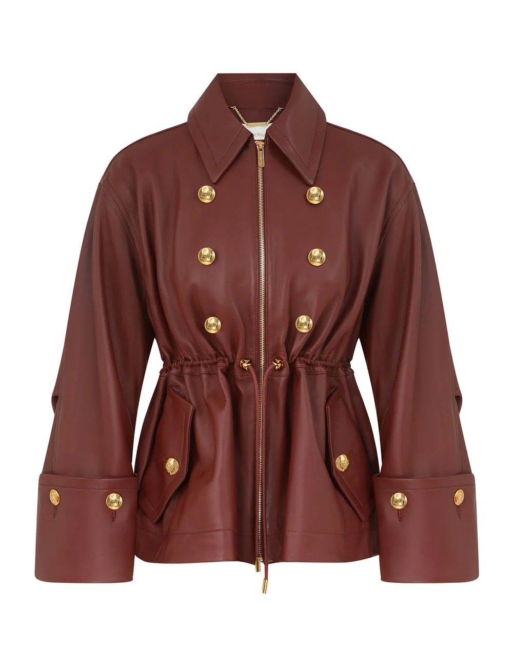 ITEM DETAILS The Rebellion Leather Crop Trench in Cinnamon from our Cruise 2026 Collection, Twisted Romance. A cropped leather trench coat featuring a classic collar, centre front zip closure, gold button detailing and a drawstring waist cord. - Trench coat in soft sheep leather - Gold zipper down centre front - Drawstring cinched waist - Folded cuffs with gold button detailing - Flap side seam pockets - Flared peplum hem Style Code: 7161JC261 SIZE DETAILS 0P 0 1 2 3 4 Length 24.5 26 26 26.5 27 27 Bust 51 53.5 56 57.5 60 61.5 Waist 27 27.5 30 32.5 34 36 Sleeve 20.5 22 22 22 22 22 Drawstring waist for flexible fit Heavy-weight fabric This garment fits true to size Available in size 0P, suited to clients who are under 5'3"/ 160cm Model is 5'9.5"/178 cm, bust size 32C/10C and wears a size 0 Item measurements are in inches CARE INSTRUCTIONS Main: sheep leather; lining: 75% viscose, 25% silk Clean professionally by a specialist leather and suede expert; Do not dry clean; Avoid water; Due to the nature of this garment colour may transfer onto clothing, accessories or furnishings Always check the label or care card for specific care instructions.