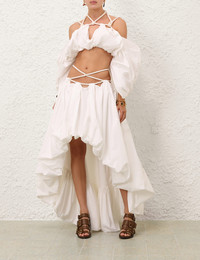 ITEM DETAILS The Rebellion Mariners Midi Skirt in Ivory from our Cruise 2026 Collection, Twisted Romance. A cotton midi skirt featuring a threaded rope waist, asymmetric high-low hem, and ruched detailing throughout. - 100% cotton fabric - High-low hem - Mid-rise waist with rope threading - Heavily gathered silhouette - Triangle cut-outs at front and back hips - Invisible zip closure at centre back Style Code: 6819SC261 SIZE DETAILS 0P 0 1 2 3 4 Length 39.5 43.5 43.5 43.5 43.5 43.5 Designed for a slightly loose fit This garment fits true to size Available in size 0P, suited to clients who are under 5'3"/ 160cm Model is 5'9.5"/178 cm, bust size 32C/10C and wears a size 0 Item measurements are in inches CARE INSTRUCTIONS Main: 100% cotton; trim: 100% cotton Dry clean only code f (hydrocarbon only); Remove any detachable trims prior to dry cleaning; Cover to protect trim; Iron in low temperature with protective cloth; Light steam only; Do not spot clean Always check the label or care card for specific care instructions.