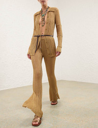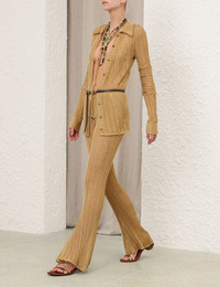 ITEM DETAILS The Rebellion Metallic Pant in Metallic Gold from our Cruise 2026 Collection, Twisted Romance. A mid-rise, full-length pant crafted from metallic knit, featuring an elasticated waistband, body-hugging silhouette, and a sheer ribbed finish. - Metallic knit pant - Mid-rise elasticated waistband - Flared hem - Sheer ribbed texture throughout Style Code: 6646PC261 SIZE DETAILS 0P 0 1 2 3 4 Length 36.5 40 40 40.5 40.5 41 Waist 25 27 28.5 30.5 32.5 34.5 Hip 31.5 34 36 38 40 41.5 Inseam 27.5 30 30 30 30 30 Elasticated waistband for a flexible fit Mid-rise waist with a full-length leg Mid-weight, stretchy fabric This garment fits true to size Available in size 0P, suited to clients who are under 5'3"/ 160cm Model is 5'9.5"/178 cm, bust size 32C/10C and wears a size 0 Item measurements are in inches CARE INSTRUCTIONS 52% polyester (metallised film), 48% polyester Dry clean only code f (hydrocarbon only) Remove any detachable trims prior to dry cleaning Cover to protect trim Iron in low temperature with protective cloth Do not spot clean Store garment flat do not hang Always check the label or care card for specific care instructions.