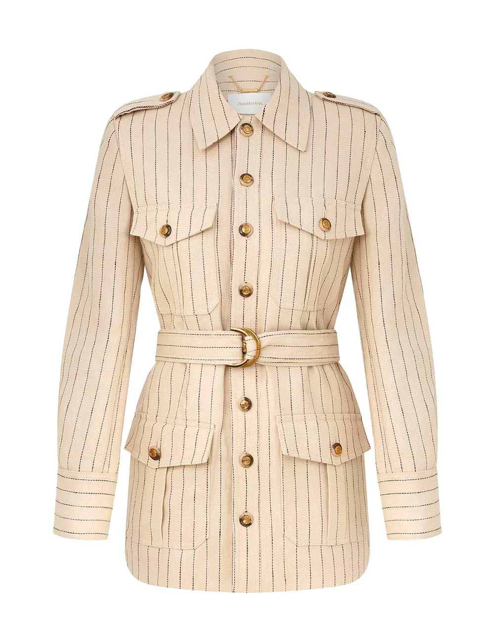 ITEM DETAILS The Rebellion Pinstripe Jacket in Cream Stripe from our Cruise 2026 Collection, Twisted Romance. A linen jacket featuring a classic collar, gold buttons down the centre front and a removable waist belt. - Linen fabric - Self covered removable belt - Functional gold buttons down centre front - Flap pockets at chest and hips - Shoulder tabs - Buttoned cuffs - Fully lined Style Code: 6989JC261 SIZE DETAILS 0P 0 1 2 3 4 Length 27 29 29.5 30 30 30.5 Bust 36 38.5 40 42.5 44 46.5 Waist 37 38.5 41 42.5 45 46.5 Sleeve 22.5 24 24.5 25 25 25 Tailored fit Mid-weight, non-stretchy fabric This garment fits true to size Available in size 0P, suited to clients who are under 5'3"/ 160cm Model is 5'9.5"/178 cm, bust size 32C/10C and wears a size 0 Item measurements are in inches CARE INSTRUCTIONS Main: 100% linen; lining: 75% viscose, 25% silk Dry clean only code f (hydrocarbon only); Remove any detachable trims prior to dry cleaning; Cover to protect trim; Iron in low temperature with protective cloth; Light steam only; Do not spot clean Always check the label or care card for specific care instructions.