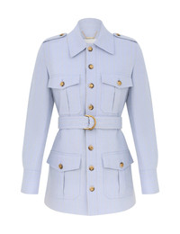 ITEM DETAILS The Rebellion Pinstripe Jacket in Sky Stripe from our Cruise 2026 Collection, Twisted Romance. A linen jacket featuring a classic collar, gold buttons down the centre front and a removable waist belt. - Linen fabric - Self covered removable belt - Functional gold buttons down centre front - Flap pockets at chest and hips - Shoulder tabs - Buttoned cuffs - Fully lined Style Code: 6989JC261 SIZE DETAILS 0P 0 1 2 3 4 Length 27 29 29.5 30 30 30.5 Bust 36 38.5 40 42.5 44 46.5 Waist 37 38.5 41 42.5 45 46.5 Sleeve 22.5 24 24.5 25 25 25 Tailored fit Mid-weight, non-stretchy fabric This garment fits true to size Available in size 0P, suited to clients who are under 5'3"/ 160cm Model is 5'9.5"/178 cm, bust size 32C/10C and wears a size 0 Item measurements are in inches CARE INSTRUCTIONS Main: 100% linen; lining: 75% viscose, 25% silk Dry clean only code f (hydrocarbon only); Remove any detachable trims prior to dry cleaning; Cover to protect trim; Iron in low temperature with protective cloth; Light steam only; Do not spot clean Always check the label or care card for specific care instructions.