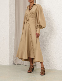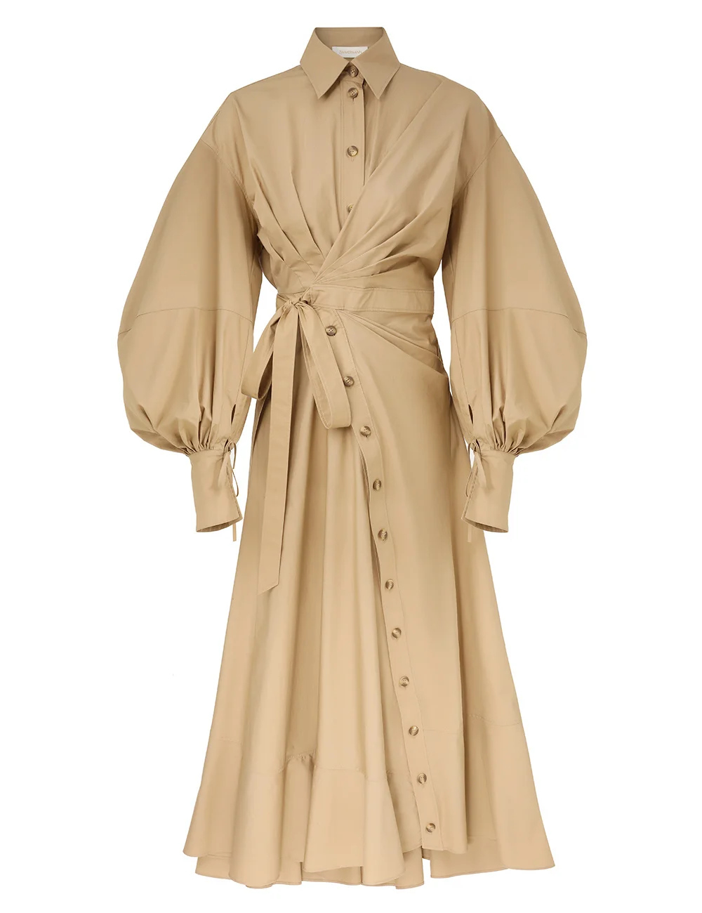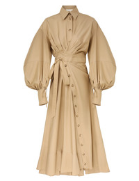 ITEM DETAILS The Rebellion Poplin Midi Dress in Olive from our Cruise 2026 Collection, Twisted Romance. A cotton midi dress featuring a wrap waist belt, long blouson sleeves, buttons down the centre front and heavy gathering throughout. - 100% cotton fabric - Classic collar - Blouson sleeves with elongated fitted cuffs - Faux buttons on skirt - Side waist tie - Functional buttons at front opening - Asymmetrical hem Style Code: 6223DC261 SIZE DETAILS 0P 0 1 2 3 4 Length 50 55 55.5 55.5 56 56.5 Sleeve 22.5 23.5 23.5 23.5 23.5 23.5 Wrap style bodice for an adjustable fit, relaxed through the skirt This garment fits true to size Available in size 0P, suited to clients who are under 5'3"/ 160cm Model is 5'9.5"/178 cm, bust size 32C/10C and wears a size 0 Item measurements are in inches CARE INSTRUCTIONS Main: 100% cotton Dry clean only code f (hydrocarbon only); Remove any detachable trims prior to dry cleaning; Cover to protect trim; Iron in low temperature with protective cloth; Light steam only; Do not spot clean Always check the label or care card for specific care instructions.