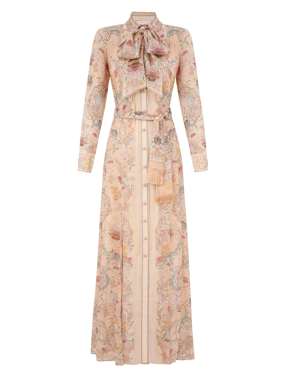 ITEM DETAILS The Rebellion Pussybow Shirt Dress in Pink Floral from our Cruise 2026 Collection, Twisted Romance. A long sleeve maxi dress featuring a classic collar with pussybow necktie and buttons down the centre front. - Classic shirt silhouette dress - Long, fitted sleeves - Functional gold buttons at the center front - Classic collar with fabric necktie - Placement printed - Removable waist belt - Comes with a separate slip Style Code: 5357DC261 SIZE DETAILS 0P 0 1 2 3 4 Length 54.5 60 60 60 60.5 60.5 Bust 32.5 34 36 38.5 40 42.5 Waist 29 30 32.5 34 36 38.5 Hip 44 45 47 49 51 53 Sleeve 27.5 29 30 30.5 30.5 31 Designed for a slightly loose fit, with a closer fit at the bust This garment fits true to size Available in size 0P, suited to clients who are under 5'3"/ 160cm Model is 5'9.5"/178 cm, bust size 32C/10C and wears a size 0 Item measurements are in inches CARE INSTRUCTIONS Main and tie: 100% viscose; slip: 100% viscose Dry clean only code f (hydrocarbon only); Remove any detachable trims prior to dry cleaning; Cover to protect trim; Iron in low temperature with protective cloth; Light steam only; Do not spot clean Gentle cold hand wash separately with mild detergent; Do not bleach; Dry in shade; Iron in low temperature with protective cloth; Do not tumble dry; Dry cleanable code f (hydrocarbon only); Always check the label or care card for specific care instructions.