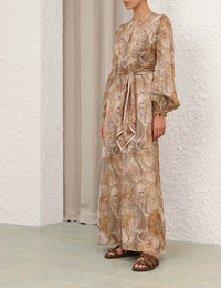 ITEM DETAILS The Rebellion Sheath Dress in Latte Leopard from our Cruise 2026 Collection, Twisted Romance. A silk maxi dress featuring a crew neckline, keyhole detailing at the bust and long billow sleeves with elasticated cuffs. - Silk fabric - Full-length gown - Removable silk scarf belt - Invisible zip closure at centre back - Long sleeves with elasticated cuffs Style Code: 7103DC261 SIZE DETAILS 0P 0 1 2 3 4 Length 54.5 59 59.5 59.5 60 60 Bust 33 35.5 37 39.5 41.5 43.5 Waist 27.5 29 30.5 33 34.5 37 Sleeve 25 27 27 27 27 27.5 Slightly fitted at the bust and waist, loose at the hip Light-weight, non-stretchy fabric This garment fits true to size Available in size 0P, suited to clients who are under 5'3"/ 160cm Model is 5'9.5"/178 cm, bust size 32C/10C and wears a size 0 Item measurements are in inches CARE INSTRUCTIONS Main: 100% silk; lining: 100% viscose; belt: 100% silk Dry clean only code f (hydrocarbon only); Remove any detachable trims prior to dry cleaning; Cover to protect trim; Iron in low temperature with protective cloth; Light steam only; Do not spot clean Always check the label or care card for specific care instructions.