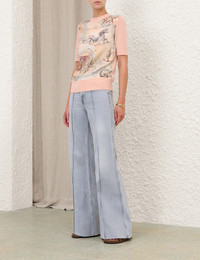 ITEM DETAILS The Rebellion Silk Front Tee in Peach/Print from our Cruise 2026 Collection, Twisted Romance. A merino wool tee featuring a crew neckline, buttons down the centre front and ribbed detailing. - Wool tee - Crew neckline - Short sleeves - Ribbed neck, hem and cuffs - Silk patterned bodice Style Code: 6624TC261 SIZE DETAILS 0P 0 1 2 3 4 Length 21 22 22.5 23 23 23 Bust 31.5 33 35.5 37 39.5 41 Waist 30 31.5 34 36 38 40 Sleeve 10 10 10.5 10.5 11 11 Slim fit This garment fits true to size Available in size 0P, suited to clients who are under 5'3"/ 160cm Model is 5'9.5"/178 cm, bust size 32C/10C and wears a size 0 Item measurements are in inches CARE INSTRUCTIONS 100% wool Dry clean only code f (hydrocarbon only) Remove any detachable trims prior to dry cleaning Cover to protect trim Iron in low temperature with protective cloth Do not spot clean Store garment flat do not hang Always check the label or care card for specific care instructions.