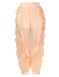 ITEM DETAILS The Rebellion Splice Harem Pant in Peach from our Cruise 2026 Collection, Twisted Romance. A silk pant featuring a fixed waistband, invisible centre back zip closure, finished with fitted cuffs and cascading frills throughout. - Silk fabric - Mid-rise, full-length pant - Side seam pockets - All-over lace trim - Side leg split - Heavily gathered - Partially lined Style Code: 7236PC261 SIZE DETAILS 0P 0 1 2 3 4 Length 36.5 40 40 40.5 41.5 41.5 Waist 27 28.5 30 32.5 34.5 36 Hip 41 42.5 44 46.5 48 50.5 Fitted at the waist, relaxed through the hips and legs Mid-rise waist with a full-length leg This garment fits true to size Available in size 0P, suited to clients who are under 5'3"/ 160cm Model is 5'9.5"/178 cm, bust size 32C/10C and wears a size 0 Item measurements are in inches CARE INSTRUCTIONS Main: 100% silk; lace: 60% polyamide, 40% cotton; lining: 100% viscose Dry clean only code f (hydrocarbon only); Remove any detachable trims prior to dry cleaning; Cover to protect trim; Iron in low temperature with protective cloth; Light steam only; Do not spot clean Always check the label or care card for specific care instructions.