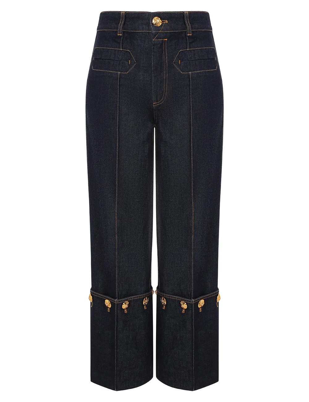 ITEM DETAILS The Rebellion Straight Crop Jean in Night Sky from our Cruise 2026 Collection, Twisted Romance. A cropped denim jean featuring a mid-rise waist, belt loops, all-over topstitching, and finished with welt pockets and gold button detailing. - Cropped-length denim jeans - Straight-leg hem - Centre front fly closure - Folded cuffs with functional button detailing - Welt pockets at front and back Style Code: 6600PC261 SIZE DETAILS 24 25 26 27 28 29 30 31 32 Length 34.5 34.5 34.5 34.5 34.5 35 Waist 26 27 28.5 29 30 30.5 Hip 34.5 35.5 36 37 38.5 38.5 Inseam 26 26 26 26 26 26 Designed to be fitted at the waist and hips Mid-rise waist with a cropped-length leg Heavy-weight, non-stretchy fabric This garment fits true to size Available in size 0P, suited to clients who are under 5'3"/ 160cm Model is 5'9.5"/178 cm, bust size 32C/10C and wears a size 0 Item measurements are in inches CARE INSTRUCTIONS Main: 75% cotton, 25% viscose; pocketing: 86% polyester, 14% cotton Gentle cold machine wash separately with mild detergent; Remove any detachable trims prior to cleaning Cover to protect trim; Do not soak or bleach; Do not tumble dry; Dry in shade without delay; Iron in low temperature with protective cloth; Do not spot clean; Dry cleanable code p Always check the label or care card for specific care instructions.