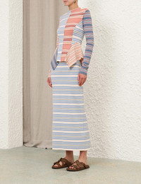 ITEM DETAILS The Rebellion Stripe Midi Skirt in Multi Stripe from our Cruise 2026 Collection, Twisted Romance. A midi-length knit skirt featuring an elasticated waist and contrasting stripes throughout. - Mid-rise knit skirt - Elasticated, ribbed waistband - Centre back vent - Slip on style Style Code: 6655SC261 SIZE DETAILS 0P 0 1 2 3 4 Length 33 36 36 36 36 36 Waist 23.5 24.5 27 29 30.5 30.5 Hip 29 30.5 33 35.5 37 37 Elastic waist for an easy fit This garment fits true to size Available in size 0P, suited to clients who are under 5'3"/ 160cm Model is 5'9.5"/178 cm, bust size 32C/10C and wears a size 0 Item measurements are in inches CARE INSTRUCTIONS 70% viscose, 30% polyester Dry clean only code f (hydrocarbon only) Remove any detachable trims prior to dry cleaning Cover to protect trim Iron in low temperature with protective cloth Do not spot clean Store garment flat do not hang Always check the label or care card for specific care instructions.