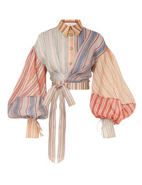ITEM DETAILS The Rebellion Striped Blouse in Spliced Stripes from our Cruise 2026 Collection, Twisted Romance. A silk-linen blouse featuring a classic collar, buttons down the centre front, long billow sleeves with exaggerated cuffs, finished with a wrap waist belt tied to one side. - Silk-linen blend fabric - Cropped style blouse - Self-tie wrap belt at right hand side - Rouleau ties at fitted cuffs - Long blouson sleeves - Heavily gathered Style Code: 7031TC261 SIZE DETAILS 0P 0 1 2 3 4 Length 14 15 15.5 15.5 15.5 16 Waist 26 27 29 30.5 33 34.5 Sleeve 22.5 24 24 24 24 24 Designed for a relaxed, cropped fit This garment fits true to size Available in size 0P, suited to clients who are under 5'3"/ 160cm Model is 5'9.5"/178 cm, bust size 32C/10C and wears a size 0 Item measurements are in inches CARE INSTRUCTIONS Main: 55% linen, 45% silk Dry clean only code f (hydrocarbon only); Remove any detachable trims prior to dry cleaning; Cover to protect trim; Iron in low temperature with protective cloth; Light steam only; Do not spot clean Always check the label or care card for specific care instructions.