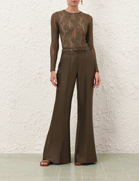 ITEM DETAILS The Rebellion Structured Flare in Dark Olive from our Cruise 2026 Collection, Twisted Romance. A wool blend pant featuring a flared silhouette, fixed waistband with removable belt, front centre pleats and side seam pockets. - Wool blend fabric - Wide flare pant - Self covered removable belt - Front fly closure - Pintucks through centre front legs - Non-functional back pockets Style Code: 6490PC261 SIZE DETAILS 0P 0 1 2 3 4 Length 36 44 44.5 45 45 45.5 Waist 26 27.5 29 31.5 33 35.5 Hip 36 38 40 42.5 44 46.5 Inseam 31.5 34.5 34.5 34.5 34.5 34.5 Designed to be fitted at the waist and hips Mid-rise waist with a full-length leg This garment fits true to size Available in size 0P, suited to clients who are under 5'3"/ 160cm Model is 5'9.5"/178 cm, bust size 32C/10C and wears a size 0 Item measurements are in inches CARE INSTRUCTIONS Main: 92% wool, 8% silk; pocketing: 75% viscose, 25% silk Dry clean only code f (hydrocarbon only); Remove any detachable trims prior to dry cleaning; Cover to protect trim; Iron in low temperature with protective cloth; Light steam only; Do not spot clean Always check the label or care card for specific care instructions.